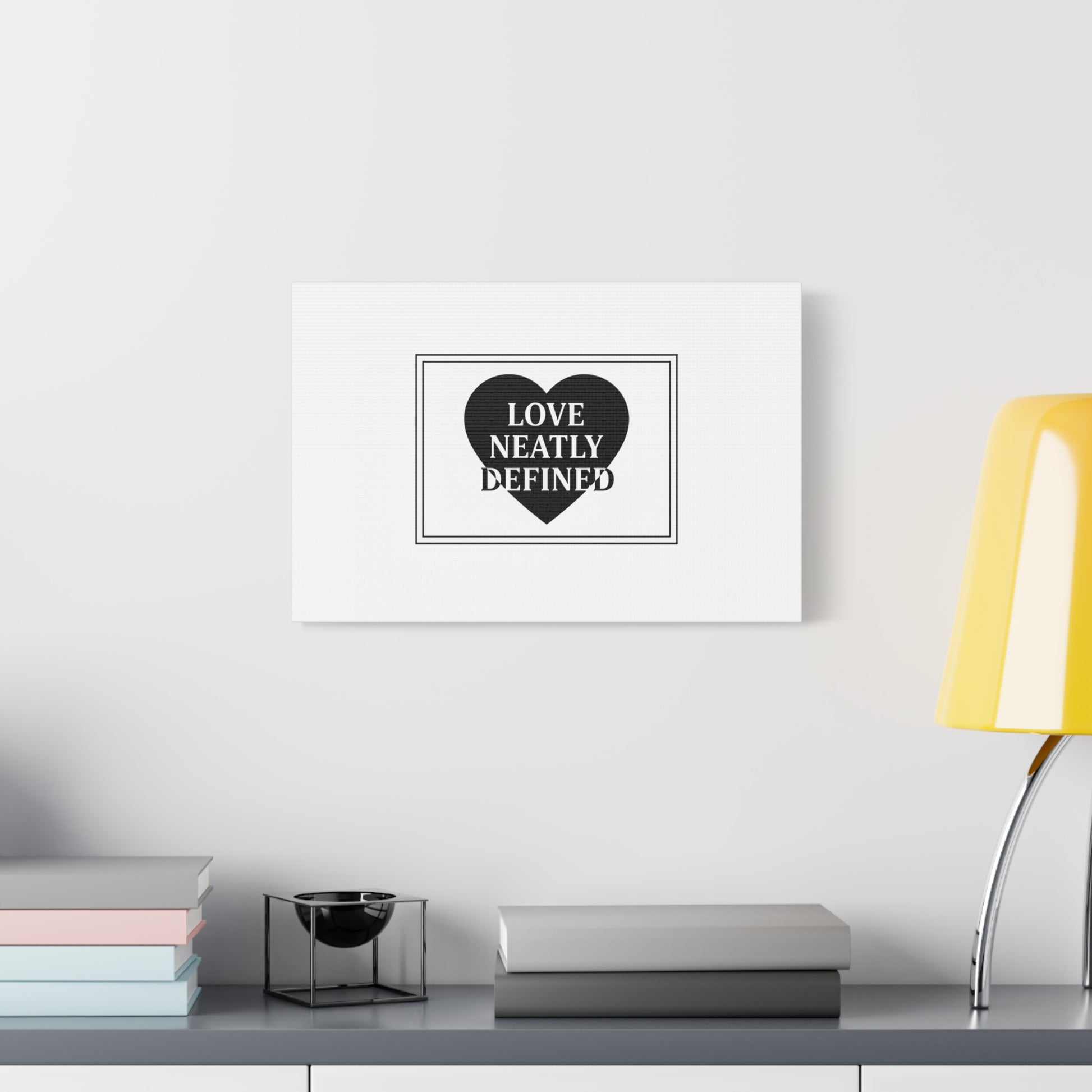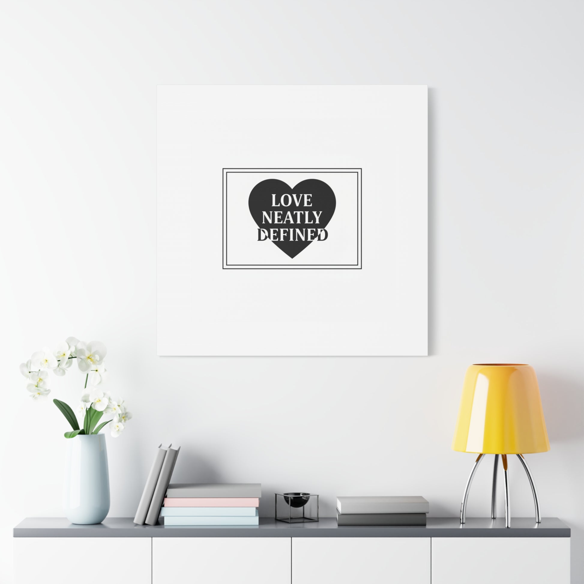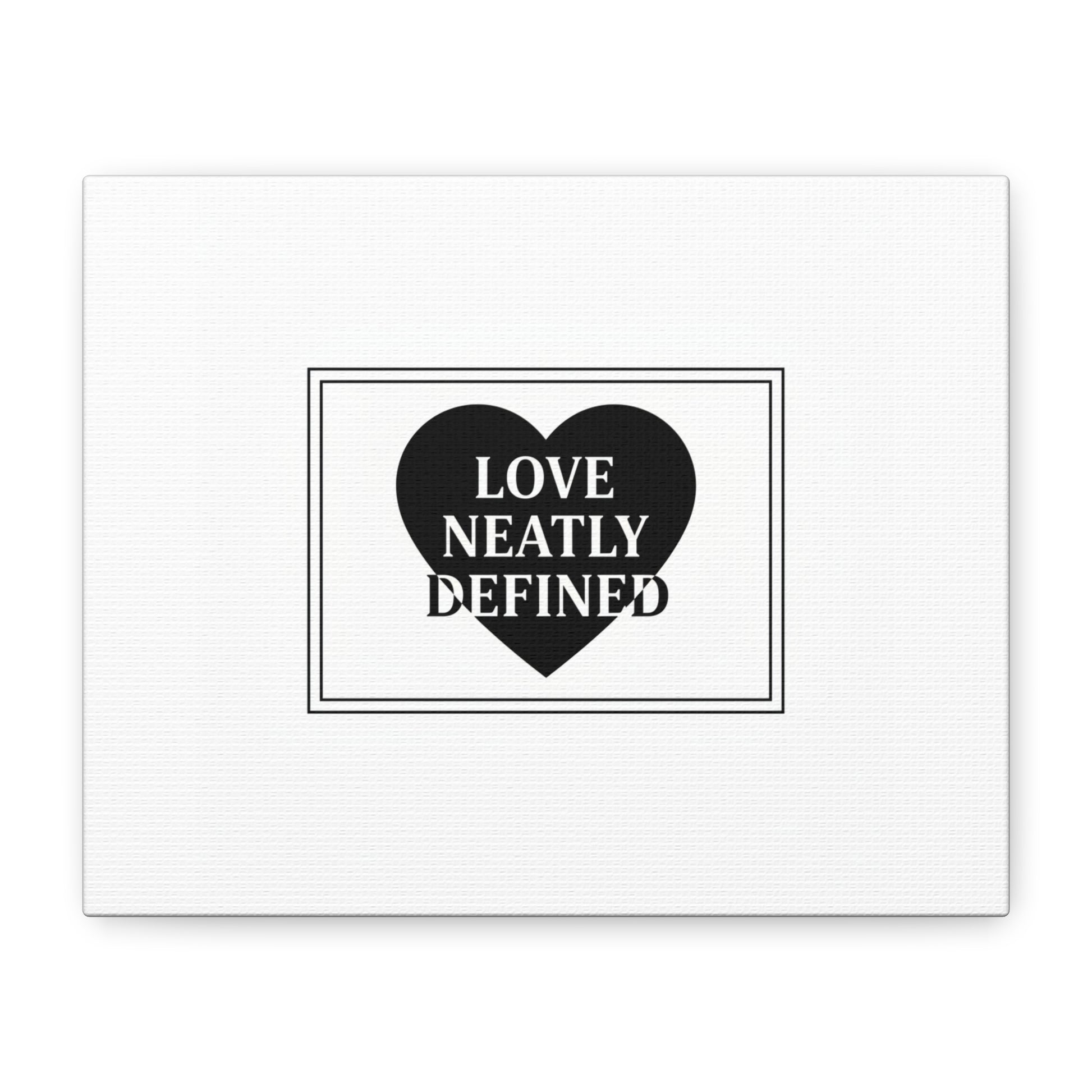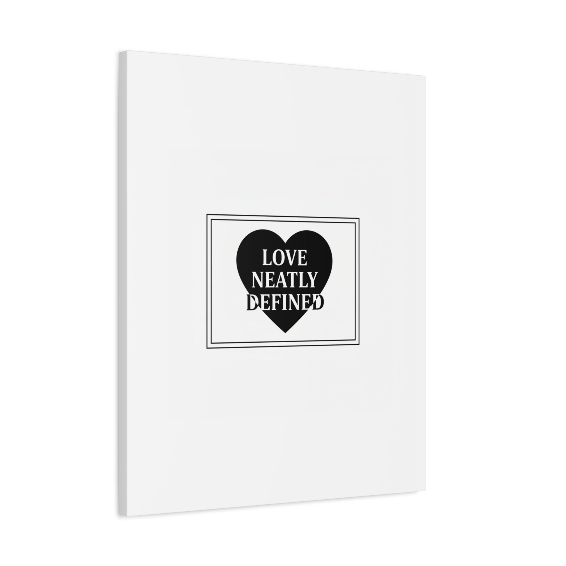 Editorial black-and-white canvas print featuring a bold serif statement inside a solid heart and double-line frame. The restrained layout—generous white space, sharp caps and classic serif letterforms—reads as a definitive, typographic declaration aligned with the Editorial Black-and-White Romance trend. Its monochrome palette and gallery-style composition lend a quiet, lasting presence to modern living rooms, bedside walls, or reading nooks where minimal romantic statements are part of the decor language.