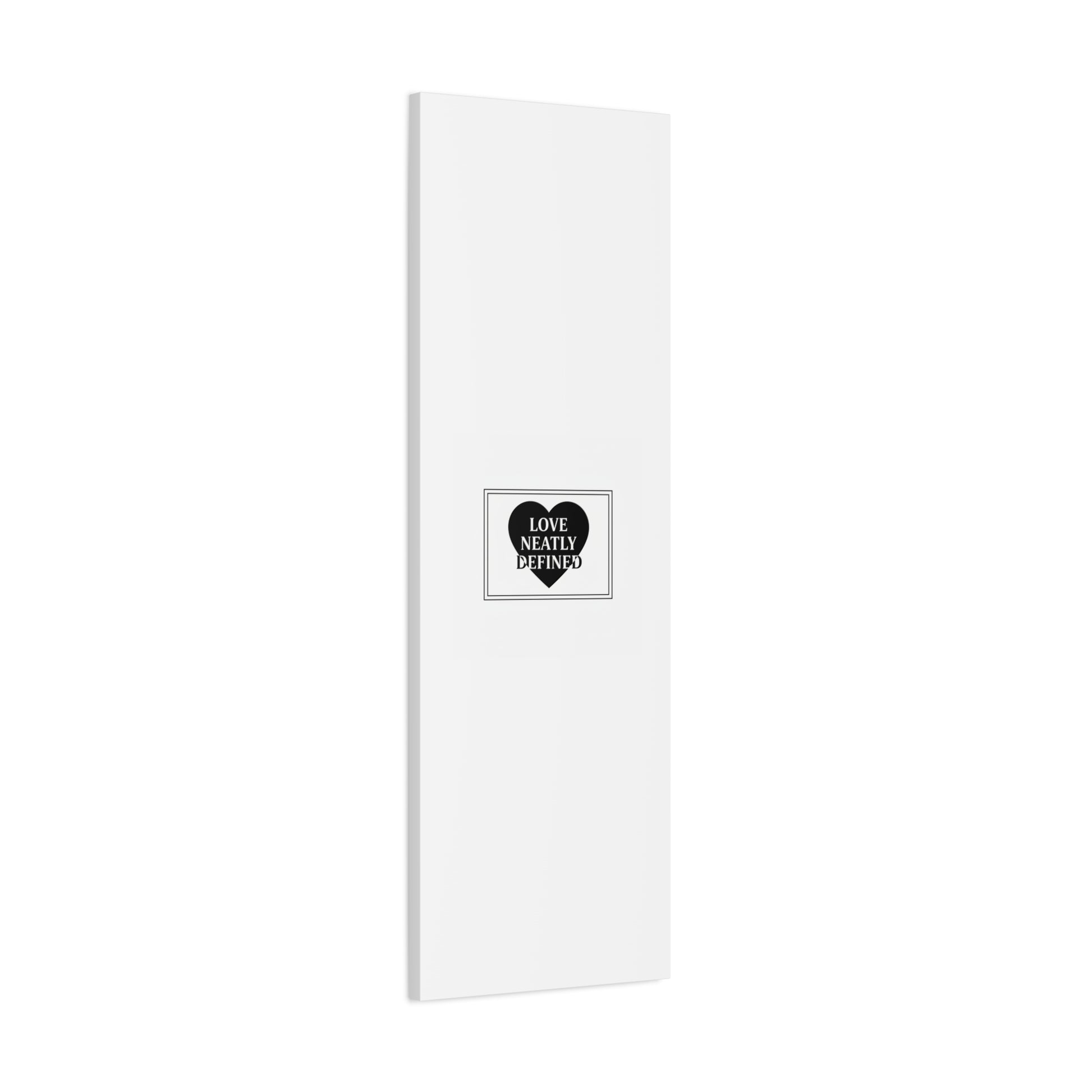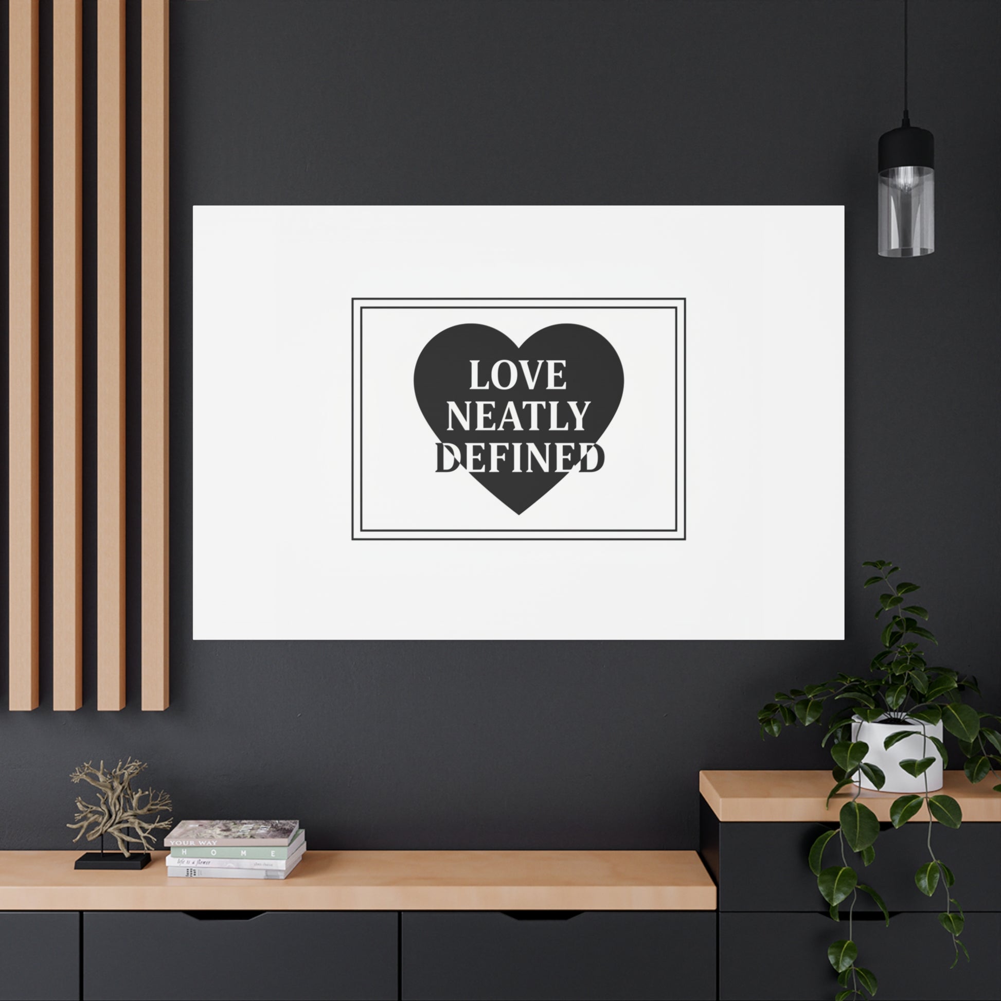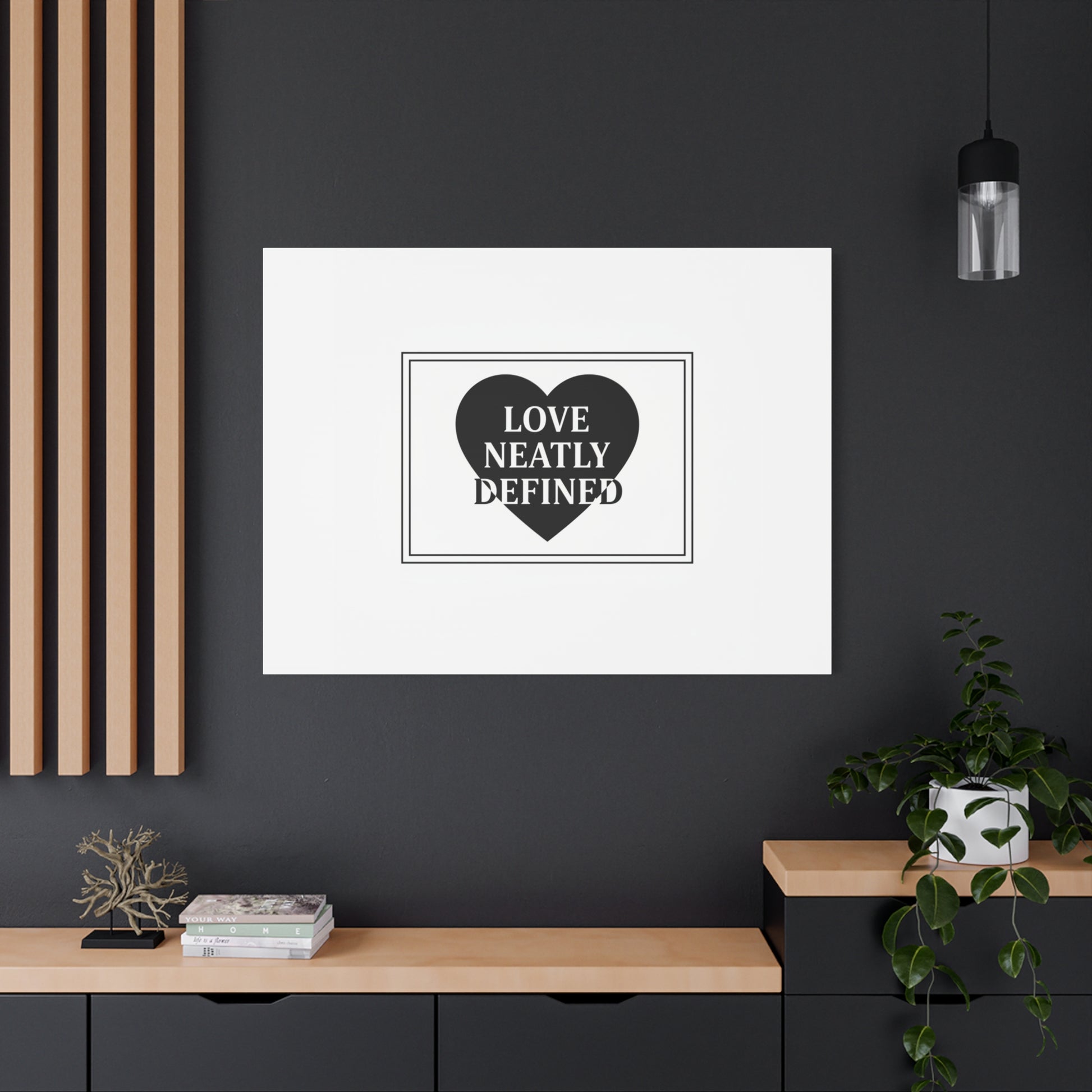 Editorial black-and-white canvas print featuring a bold serif statement inside a solid heart and double-line frame. The restrained layout—generous white space, sharp caps and classic serif letterforms—reads as a definitive, typographic declaration aligned with the Editorial Black-and-White Romance trend. Its monochrome palette and gallery-style composition lend a quiet, lasting presence to modern living rooms, bedside walls, or reading nooks where minimal romantic statements are part of the decor language.