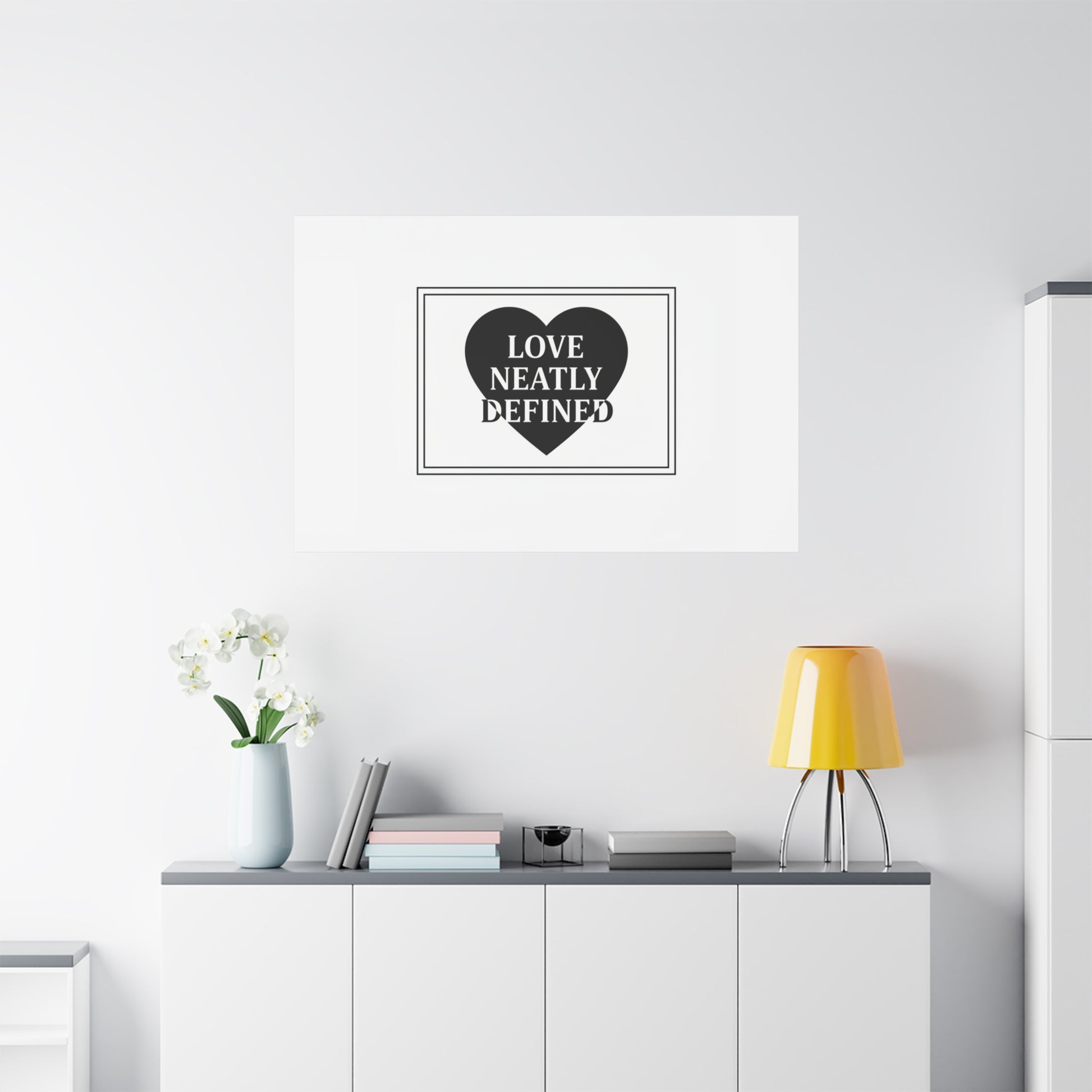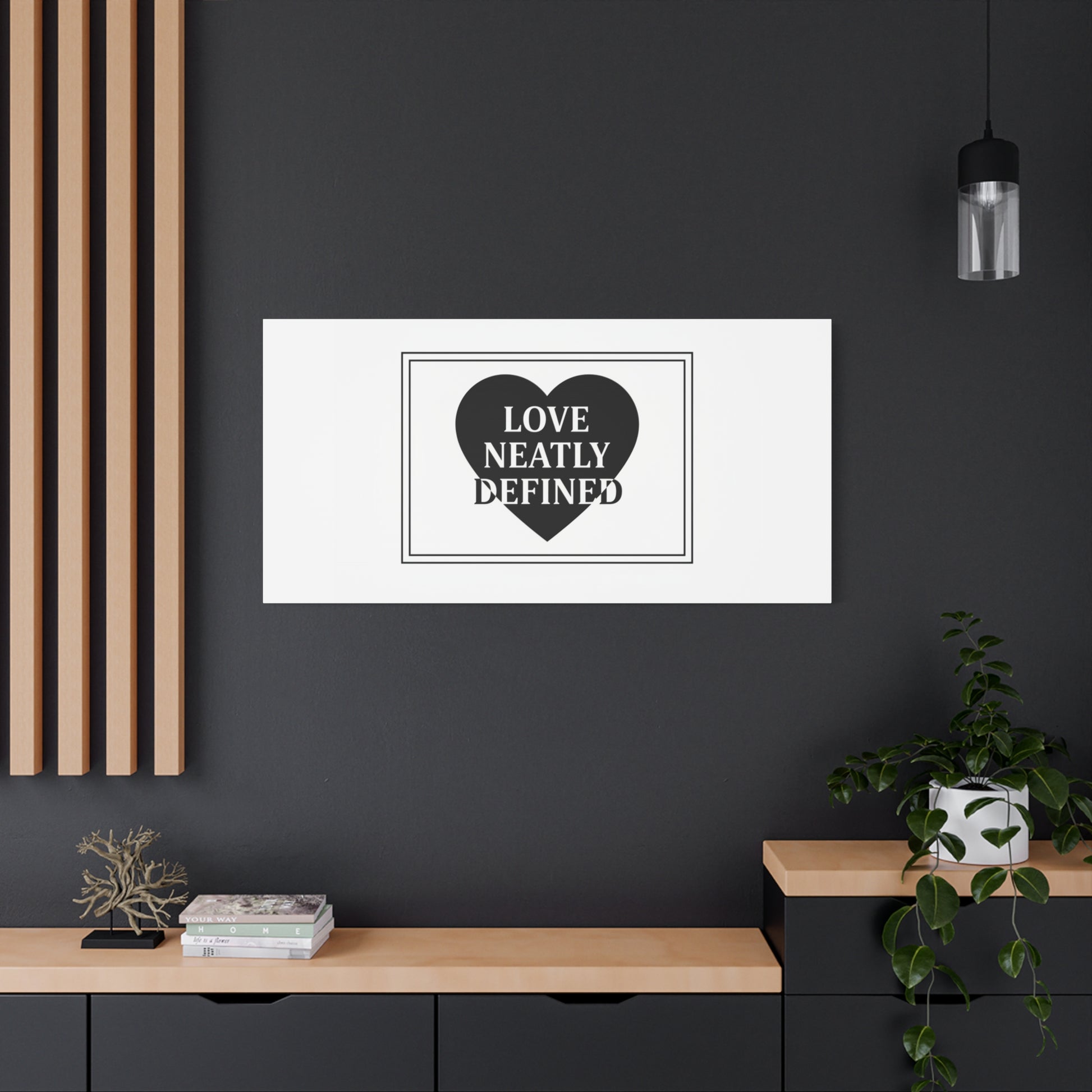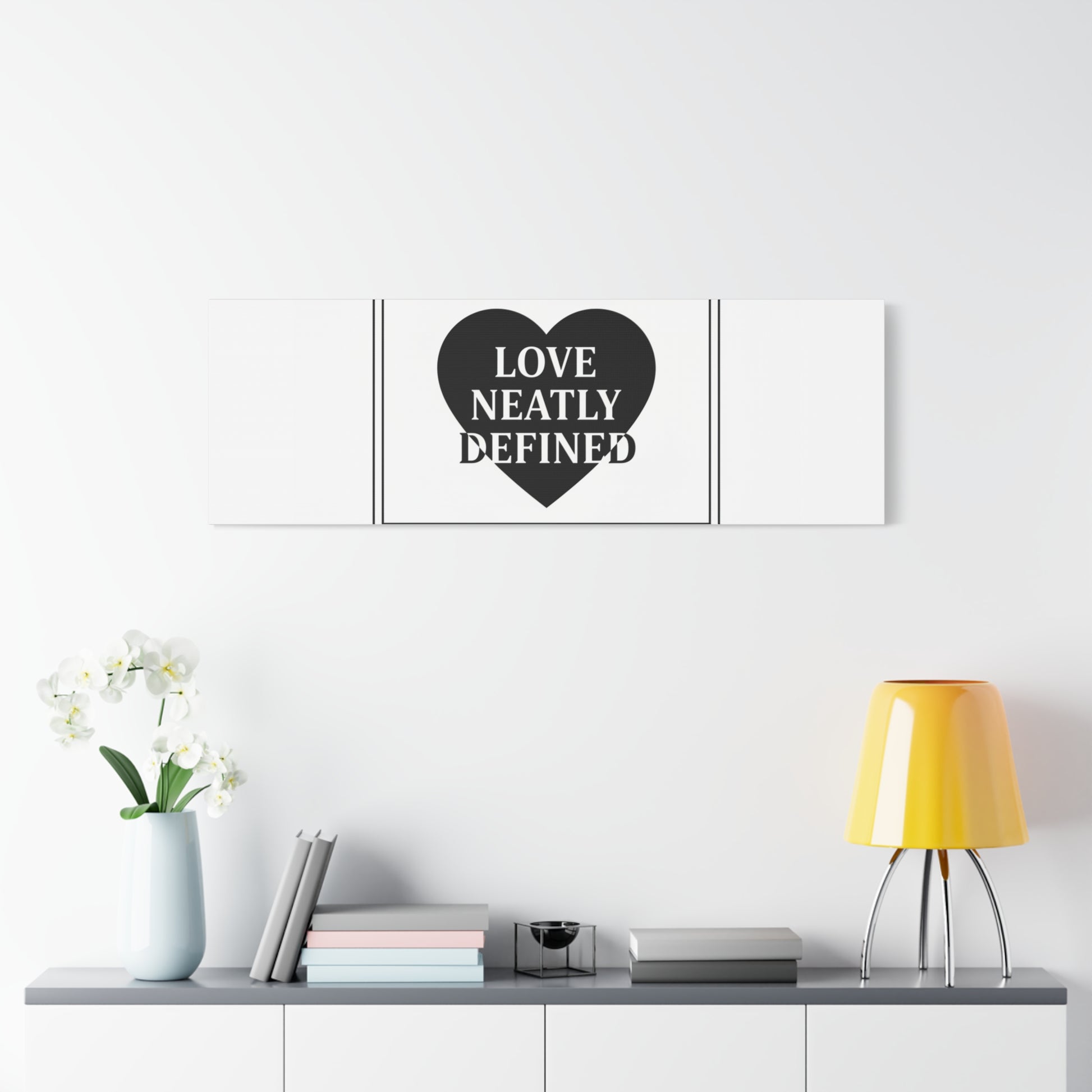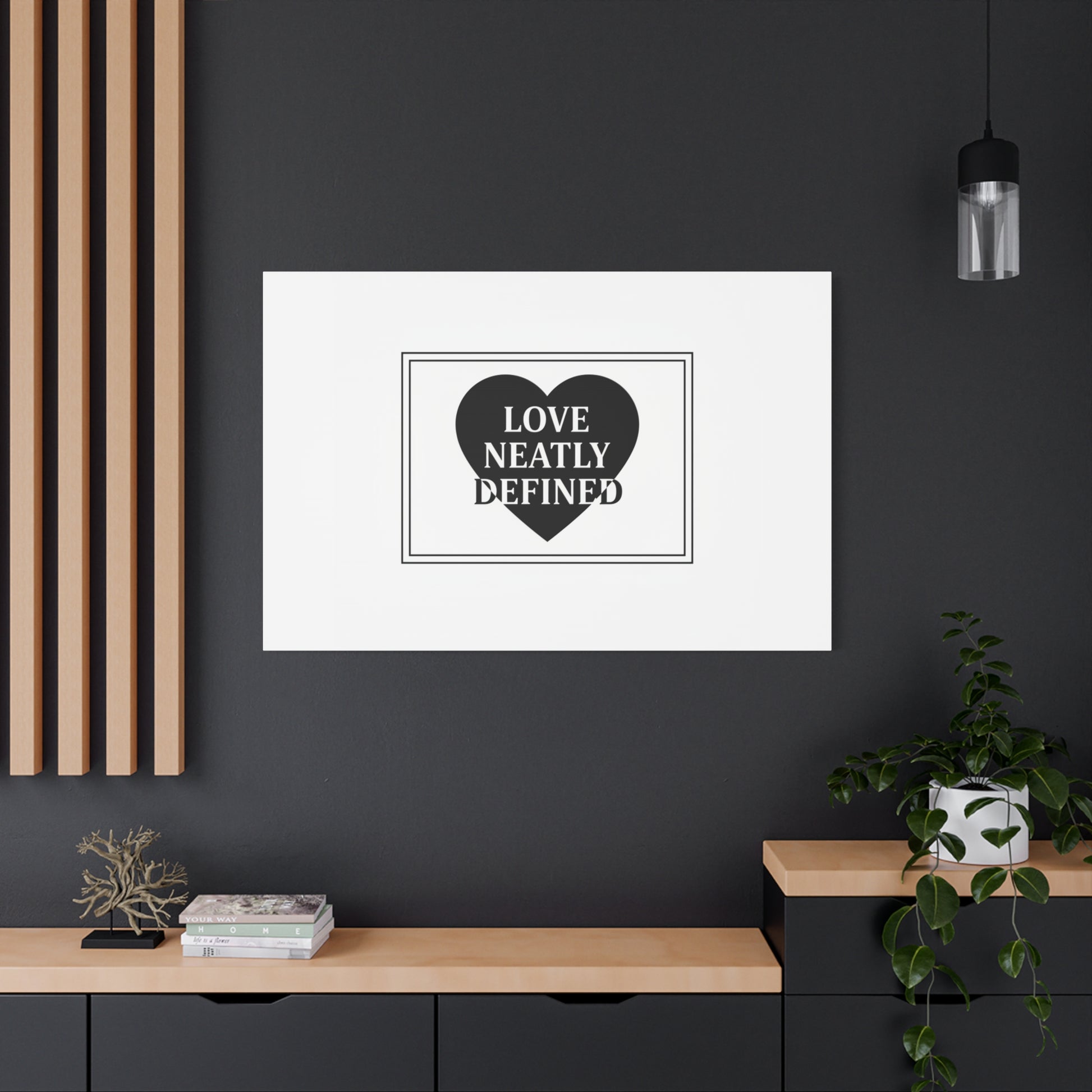 Editorial black-and-white canvas print featuring a bold serif statement inside a solid heart and double-line frame. The restrained layout—generous white space, sharp caps and classic serif letterforms—reads as a definitive, typographic declaration aligned with the Editorial Black-and-White Romance trend. Its monochrome palette and gallery-style composition lend a quiet, lasting presence to modern living rooms, bedside walls, or reading nooks where minimal romantic statements are part of the decor language.